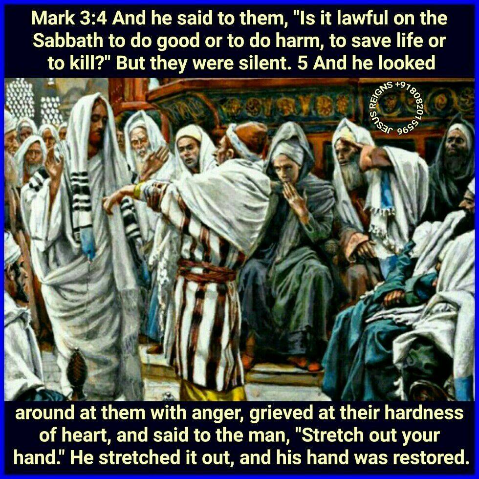 1 Again he entered the synagogue, and a man was there who had a withered hand. 2 And they watched him, to see whether he would heal him on the Sabbath, so that they might accuse him. 3 And he said to the man who had the withered hand, "Come here." 4 And he said to them, "Is it lawful on the Sabbath to do good or to do harm, to save life or to kill?" But they were silent. 5 And he looked around at them with anger, grieved at their hardness of heart, and said to the man, "Stretch out your hand." He stretched it out, and his hand was restored. 6 The Pharisees went out, and immediately held counsel with the Herodians against him, how to destroy him.