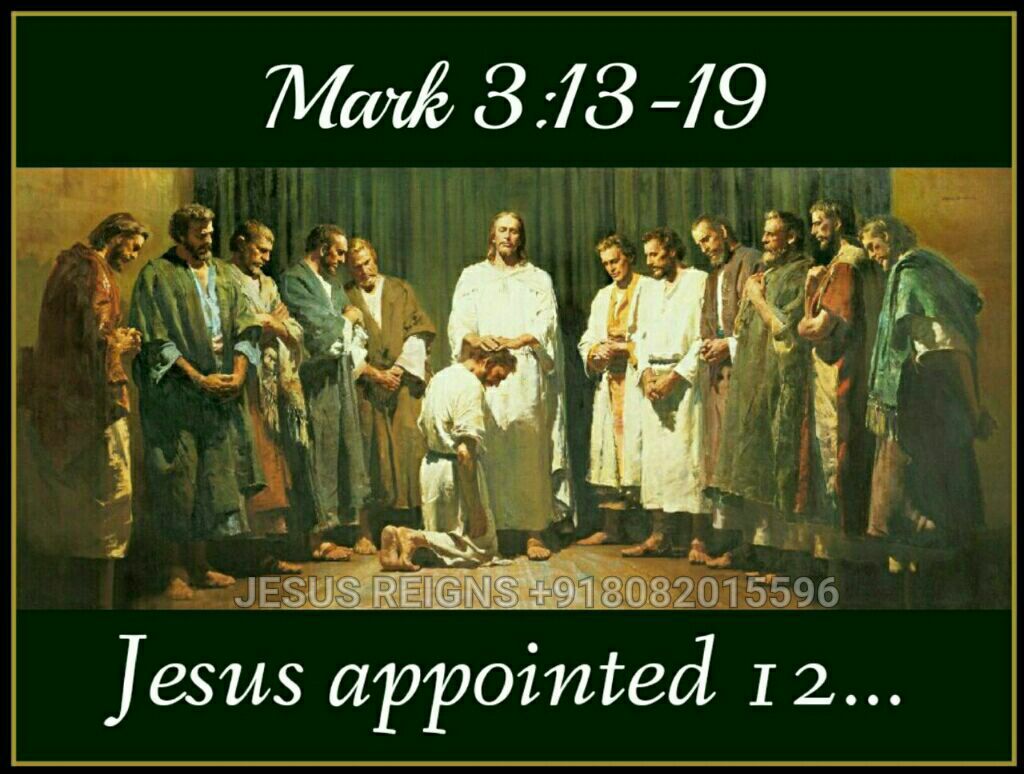 13 And he went up on the mountain, and called to him those whom he desired; and they came to him. 14 And he appointed twelve, to be with him, and to be sent out to preach 15 and have authority to cast out demons: 16 Simon whom he surnamed Peter; 17 James the son of Zebedee and John the brother of James, whom he surnamed Boanerges, that is, sons of thunder; 18 Andrew, and Philip, and Bartholomew, and Matthew, and Thomas, and James the son of Alphaeus, and Thaddaeus, and Simon the Cananaean, 19 and Judas Iscariot, who betrayed him. Then he went home.