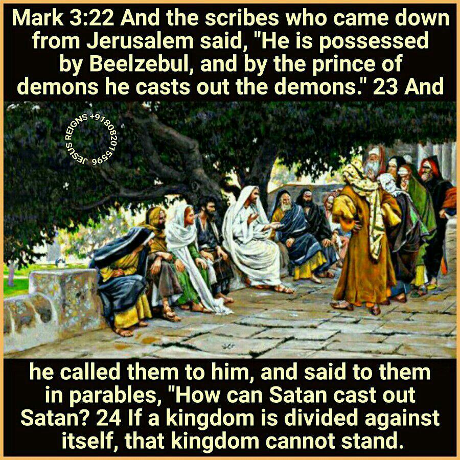 22 And the scribes who came down from Jerusalem said, "He is possessed by Beelzebul, and by the prince of demons he casts out the demons." 23 And he called them to him, and said to them in parables, "How can Satan cast out Satan? 24 If a kingdom is divided against itself, that kingdom cannot stand. 25 And if a house is divided against itself, that house will not be able to stand. 26 And if Satan has risen up against himself and is divided, he cannot stand, but is coming to an end. 27 But no one can enter a strong man's house and plunder his goods, unless he first binds the strong man; then indeed he may plunder his house. 28 "Truly, I say to you, all sins will be forgiven the sons of men, and whatever blasphemies they utter; 29 but whoever blasphemes against the Holy Spirit never has forgiveness, but is guilty of an eternal sin" 30 for they had said, "He has an unclean spirit."