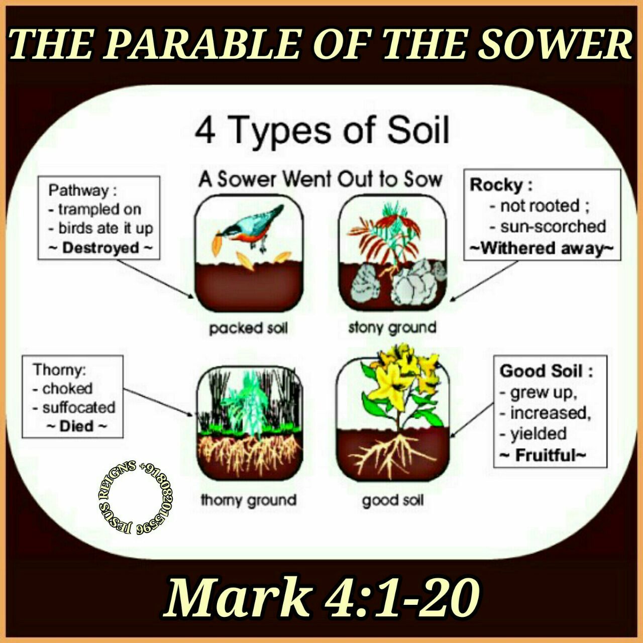 13 And he said to them, "Do you not understand this parable? How then will you understand all the parables? 14 The sower sows the word. 15 And these are the ones along the path, where the word is sown; when they hear, Satan immediately comes and takes away the word which is sown in them. 16 And these in like manner are the ones sown upon rocky ground, who, when they hear the word, immediately receive it with joy; 17 and they have no root in themselves, but endure for a while; then, when tribulation or persecution arises on account of the word, immediately they fall away. 18 And others are the ones sown among thorns; they are those who hear the word, 19 but the cares of the world, and the delight in riches, and the desire for other things, enter in and choke the word, and it proves unfruitful. 20 But those that were sown upon the good soil are the ones who hear the word and accept it and bear fruit, thirty fold and sixty fold and a hundredfold."