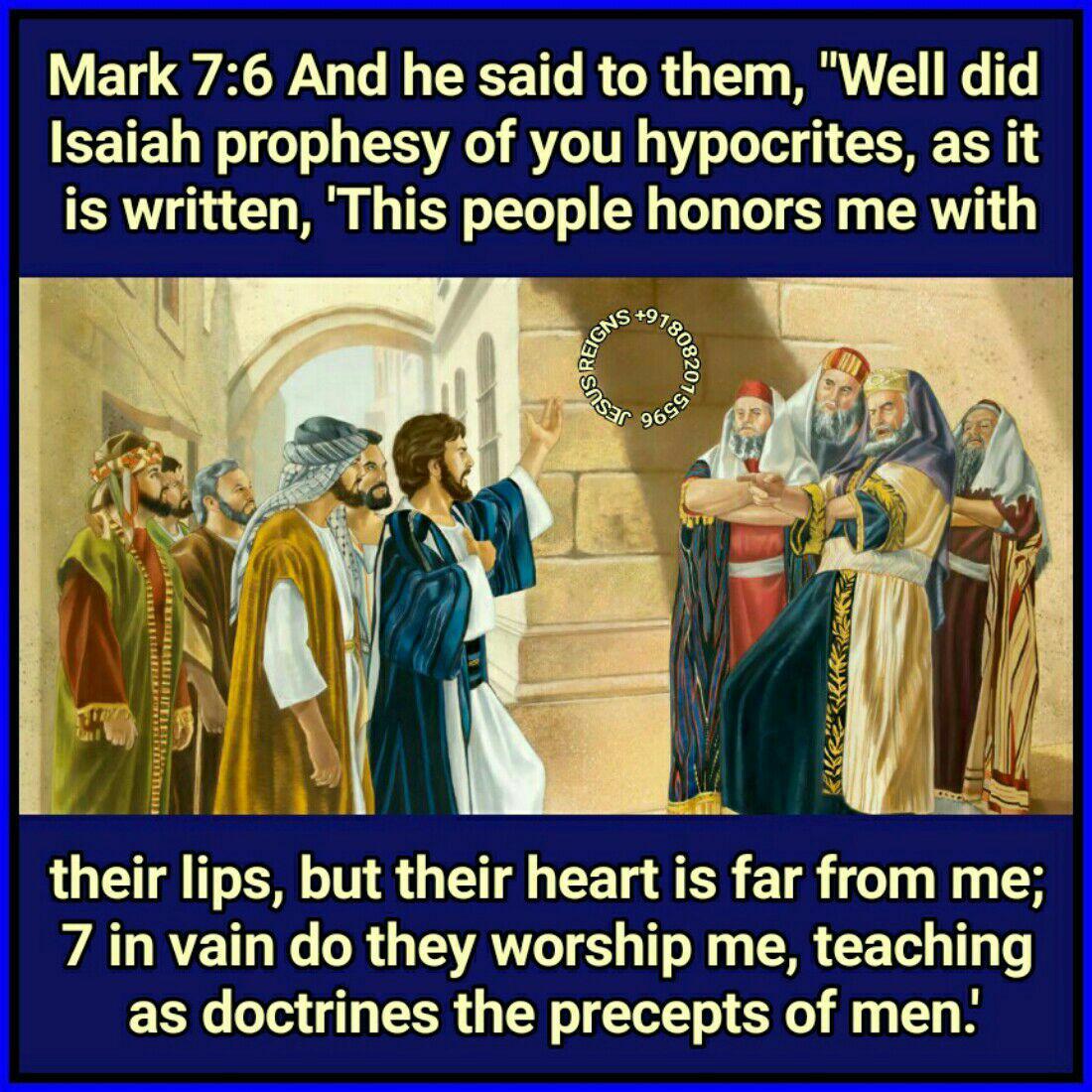 1 Now when the Pharisees gathered together to him, with some of the scribes, who had come from Jerusalem, 2 they saw that some of his disciples ate with hands defiled, that is, unwashed. 3 (For the Pharisees, and all the Jews, do not eat unless they wash their hands, observing the tradition of the elders; 4 and when they come from the market place, they do not eat unless they purify themselves; and there are many other traditions which they observe, the washing of cups and pots and vessels of bronze.) 5 And the Pharisees and the scribes asked him, "Why do your disciples not live according to the tradition of the elders, but eat with hands defiled?" 6 And he said to them, "Well did Isaiah prophesy of you hypocrites, as it is written, `This people honors me with their lips, but their heart is far from me; 7 in vain do they worship me, teaching as doctrines the precepts of men.' 8 You leave the commandment of God, and hold fast the tradition of men." 9 And he said to them, "You have a fine way of rejecting the commandment of God, in order to keep your tradition! 10 For Moses said, `Honor your father and your mother'; and, `He who speaks evil of father or mother, let him surely die'; 11 but you say, `If a man tells his father or his mother, What you would have gained from me is Corban' (that is, given to God) - 12 then you no longer permit him to do anything for his father or mother, 13 thus making void the word of God through your tradition which you hand on. And many such things you do."