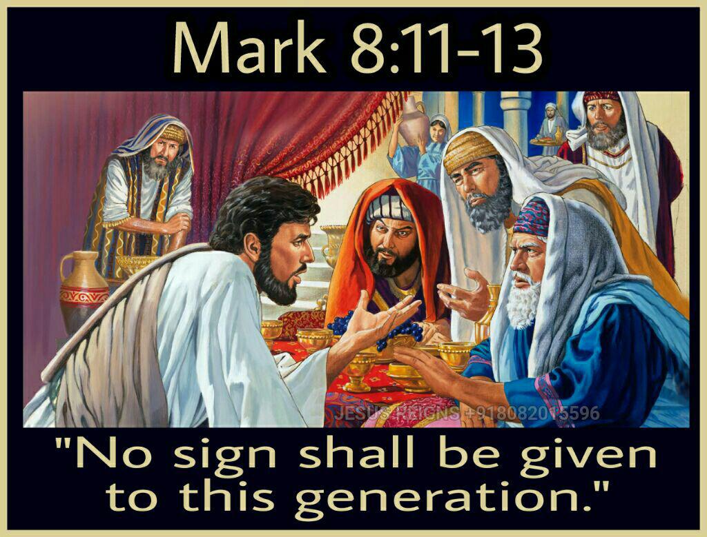 11 The Pharisees came and began to argue with him, seeking from him a sign from heaven, to test him. 12 And he sighed deeply in his spirit, and said, "Why does this generation seek a sign? Truly, I say to you, no sign shall be given to this generation." 13 And he left them, and getting into the boat again he departed to the other side.