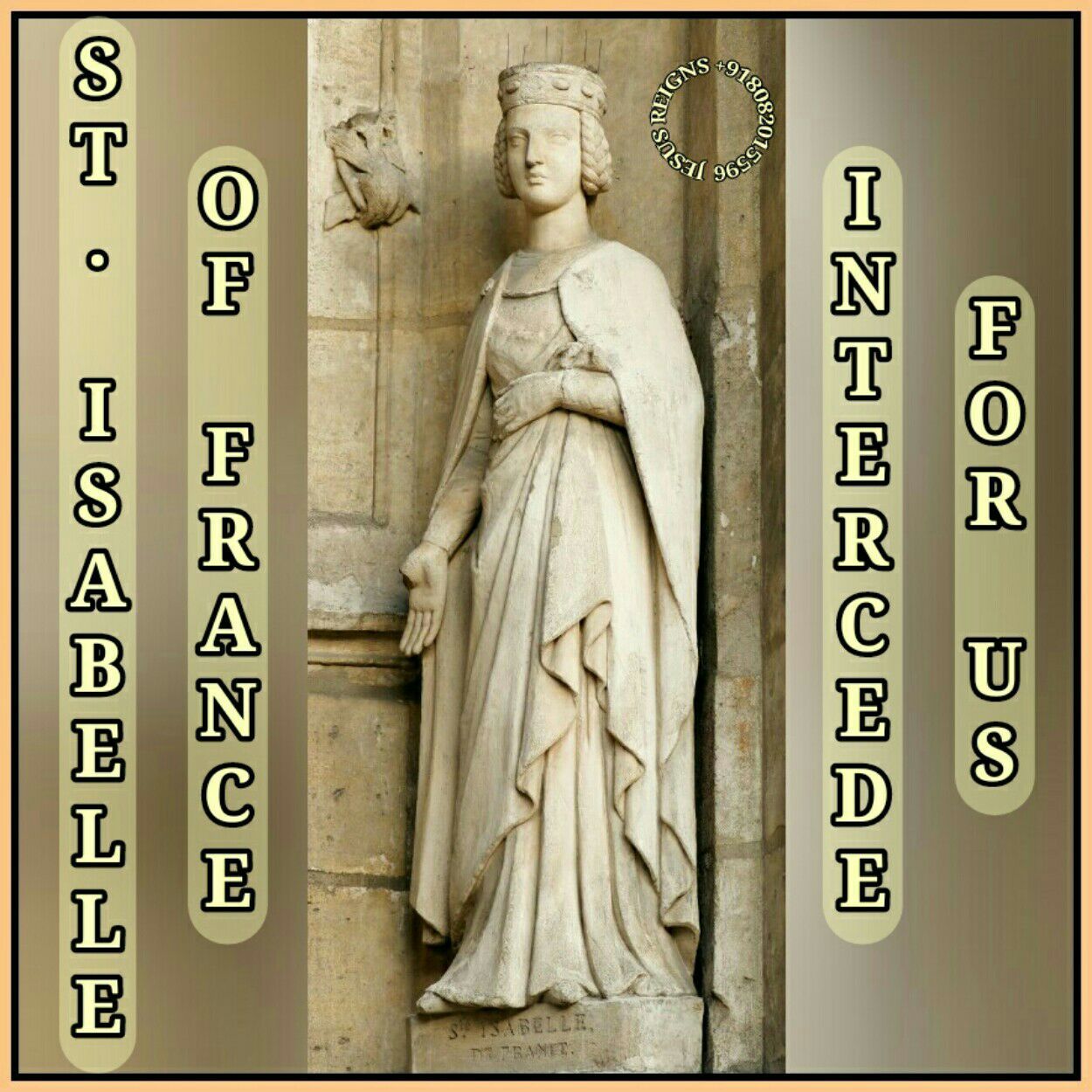 The life of Saint Isabelle suggests to us that our human weaknesses, even those of the body, can be overcome by the grace of God. Isabelle, despite pressure to do otherwise for personal and political gain, resisted the pressure of the Courts of France to marry, remaining a virgin, and consecrating herself to God. She sought out the spiritual direction she needed, listened for the call of the Lord, and followed it without question. Despite sickness and discomfort throughout her life, she found the strength to serve the Lord and those around her. So eager to rejoin her Maker, she was rewarded with knowledge of when that would happen, which she awaited with joy. Saint Isabelle of France inspires us to examine our lives, identifying those small barriers we hide behind, rather than serving God. Whether it be work, sickness, fatigue, or financial security, we all have many reasons—many excuses—to focus on ourselves, rather than on the Lord, and through Him, on those in need around us. This is a perfect opportunity to broaden our view from ourselves to those around us, breaking down our barriers, and embracing the Lord in those we serve.