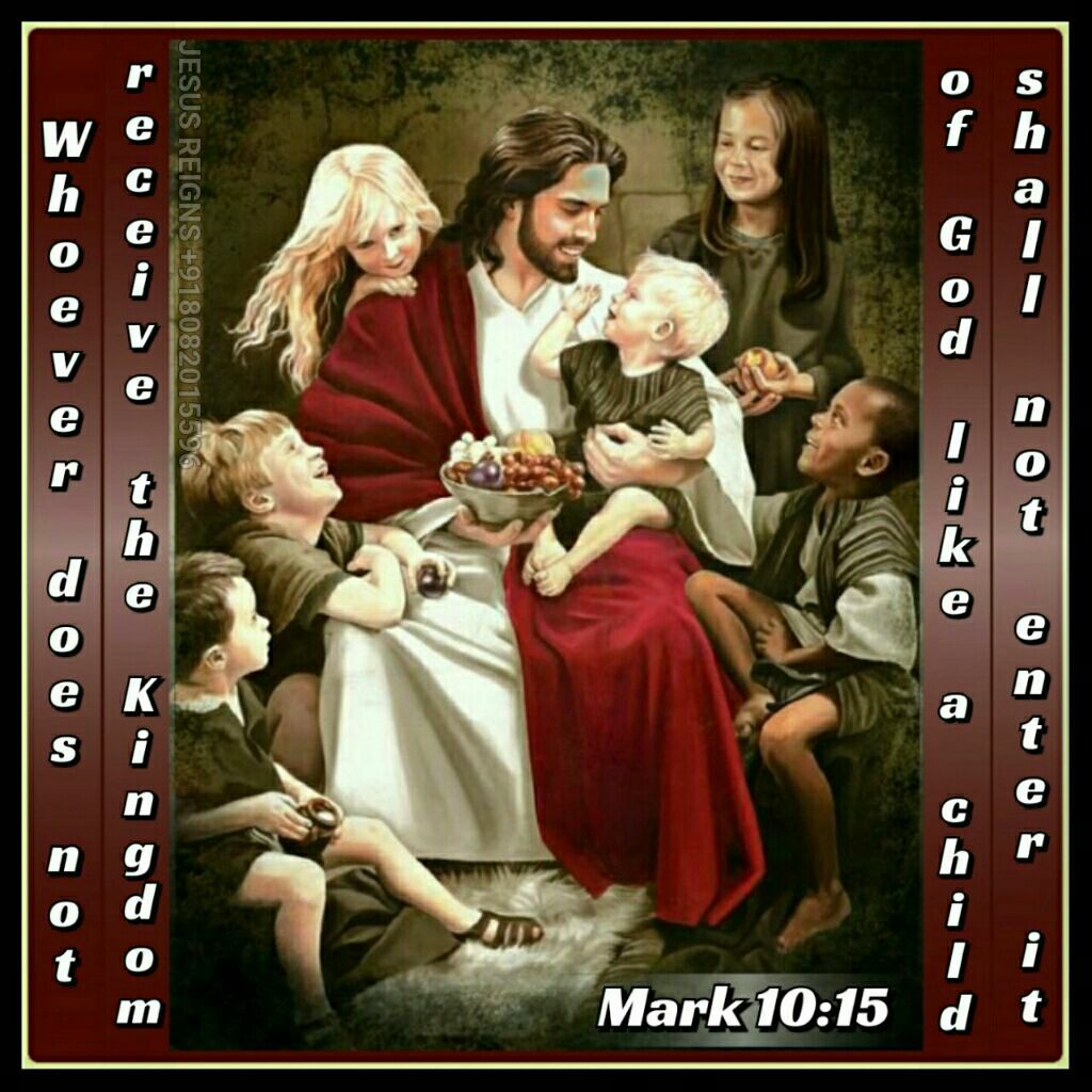 13 And they were bringing children to him, that he might touch them; and the disciples rebuked them. 14 But when Jesus saw it he was indignant, and said to them, "Let the children come to me, do not hinder them; for to such belongs the kingdom of God. 15 Truly, I say to you, whoever does not receive the kingdom of God like a child shall not enter it." 16 And he took them in his arms and blessed them, laying his hands upon them.