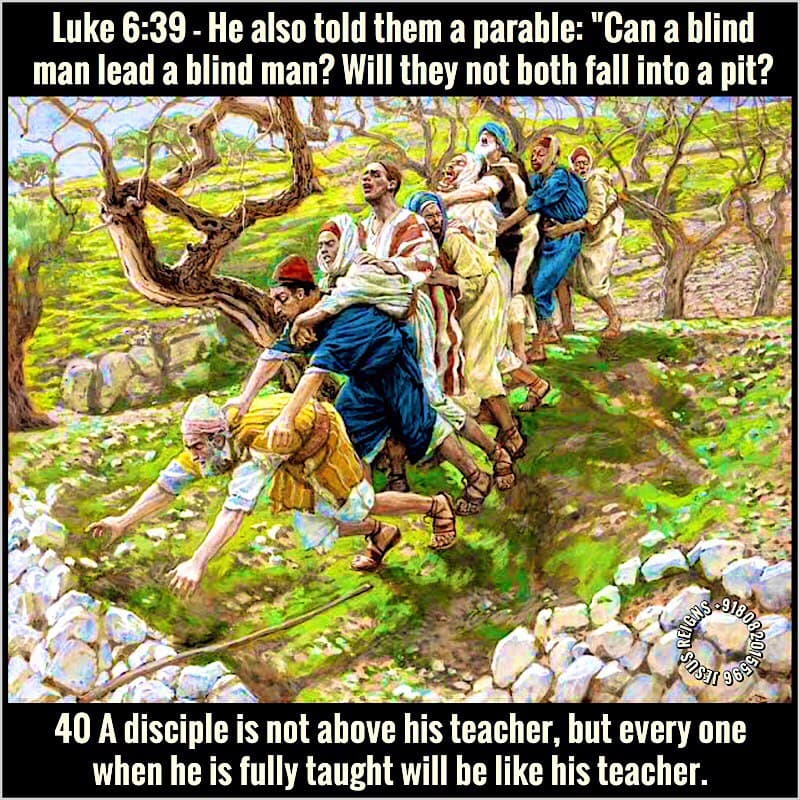 39 He also told them a parable: "Can a blind man lead a blind man? Will they not both fall into a pit? 40 A disciple is not above his teacher, but every one when he is fully taught will be like his teacher. 41 Why do you see the speck that is in your brother's eye, but do not notice the log that is in your own eye? 42 Or how can you say to your brother, `Brother, let me take out the speck that is in your eye,' when you yourself do not see the log that is in your own eye? You hypocrite, first take the log out of your own eye, and then you will see clearly to take out the speck that is in your brother's eye. 43 For no good tree bears bad fruit, nor again does a bad tree bear good fruit; 44 for each tree is known by its own fruit. For figs are not gathered from thorns, nor are grapes picked from a bramble bush. 45 The good man out of the good treasure of his heart produces good, and the evil man out of his evil treasure produces evil; for out of the abundance of the heart his mouth speaks.