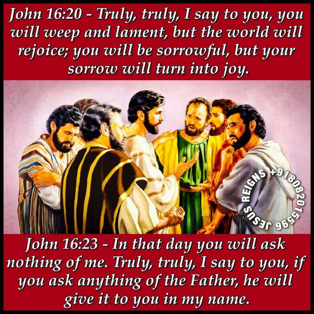 20 Truly, truly, I say to you, you will weep and lament, but the world will rejoice; you will be sorrowful, but your sorrow will turn into joy. 21 When a woman is in travail she has sorrow, because her hour has come; but when she is delivered of the child, she no longer remembers the anguish, for joy that a child is born into the world. 22 So you have sorrow now, but I will see you again and your hearts will rejoice, and no one will take your joy from you. 23 In that day you will ask nothing of me. Truly, truly, I say to you, if you ask anything of the Father, he will give it to you in my name.
