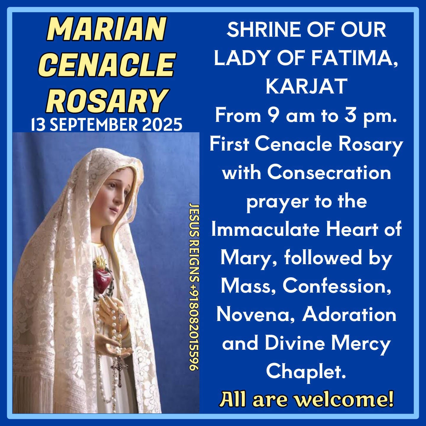 We are happy to announce that the Marian Movement of Priests, Religious & Laity will be having our First Marian Cenacle Rosary at Our Lady of Fatima Church, Karjat⛪ on SATURDAY, 13th SEPTEMBER 2025, 9.00 am: Mass followed by Marian Rosary Cenacle