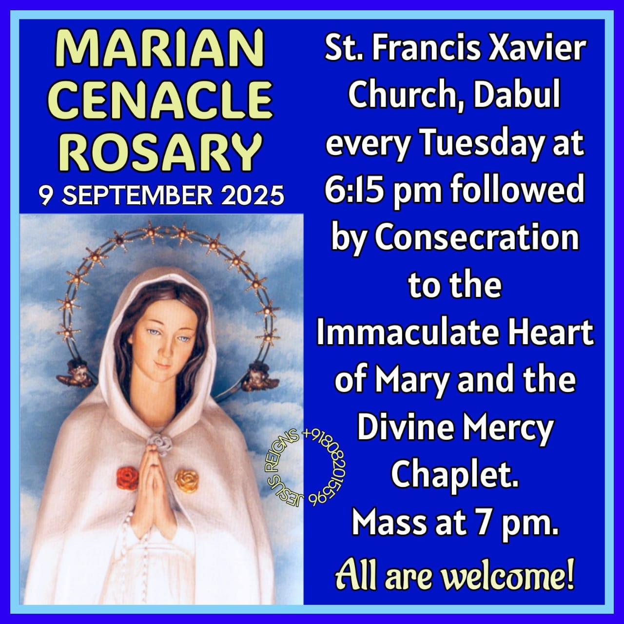 MMP Cenacle on 9th September 2025 From 6.15 pm to 6.50 pm at St. Francis Xavier Church, Dabul, Chira Bazar, Mumbai.