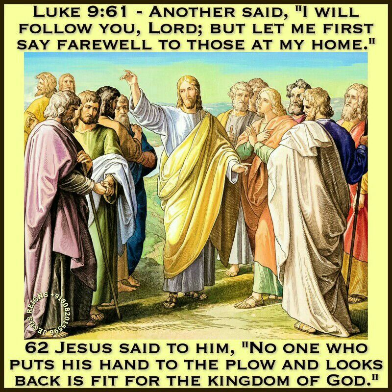 57 As they were going along the road, a man said to him, "I will follow you wherever you go." 58 And Jesus said to him, "Foxes have holes, and birds of the air have nests; but the Son of man has nowhere to lay his head." 59 To another he said, "Follow me." But he said, "Lord, let me first go and bury my father." 60 But he said to him, "Leave the dead to bury their own dead; but as for you, go and proclaim the kingdom of God." 61 Another said, "I will follow you, Lord; but let me first say farewell to those at my home." 62 Jesus said to him, "No one who puts his hand to the plow and looks back is fit for the kingdom of God."