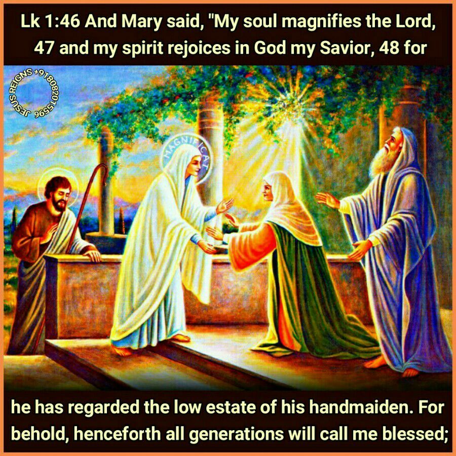 46 And Mary said, "My soul magnifies the Lord, 47 and my spirit rejoices in God my Savior, 48 for he has regarded the low estate of his handmaiden. For behold, henceforth all generations will call me blessed; 49 for he who is mighty has done great things for me, and holy is his name. 50 And his mercy is on those who fear him from generation to generation. 51 He has shown strength with his arm, he has scattered the proud in the imagination of their hearts, 52 he has put down the mighty from their thrones, and exalted those of low degree; 53 he has filled the hungry with good things, and the rich he has sent empty away. 54 He has helped his servant Israel, in remembrance of his mercy, 55 as he spoke to our fathers, to Abraham and to his posterity for ever." 56 And Mary remained with her about three months, and returned to her home.
