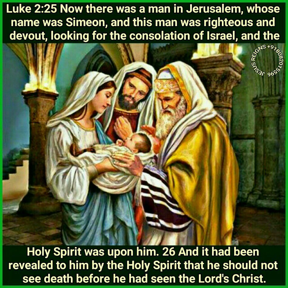 22 And when the time came for their purification according to the law of Moses, they brought him up to Jerusalem to present him to the Lord 23 as it is written in the law of the Lord, "Every male that opens the womb shall be called holy to the Lord" 24 and to offer a sacrifice according to what is said in the law of the Lord, "a pair of turtledoves, or two young pigeons." 25 Now there was a man in Jerusalem, whose name was Simeon, and this man was righteous and devout, looking for the consolation of Israel, and the Holy Spirit was upon him. 26 And it had been revealed to him by the Holy Spirit that he should not see death before he had seen the Lord's Christ. 27 And inspired by the Spirit he came into the temple; and when the parents brought in the child Jesus, to do for him according to the custom of the law, 28 he took him up in his arms and blessed God and said, 29 "Lord, now let your servant depart in peace, according to your word; 30 for my eyes have seen your salvation 31 which you have prepared in the presence of all peoples, 32 a light for revelation to the Gentiles, and for glory to your people Israel." 33 And his father and his mother marveled at what was said about him; 34 and Simeon blessed them and said to Mary his mother, "Behold, this child is set for the fall and rising of many in Israel, and for a sign that is spoken against 35 and a sword will pierce through your own soul also, that thoughts out of many hearts may be revealed."