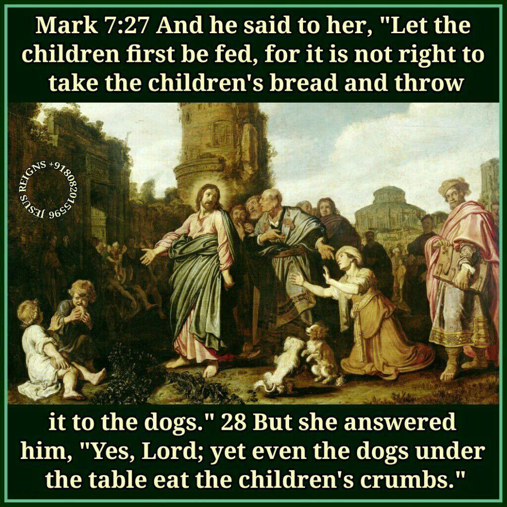 24 And from there he arose and went away to the region of Tyre and Sidon. And he entered a house, and would not have any one know it; yet he could not be hid. 25 But immediately a woman, whose little daughter was possessed by an unclean spirit, heard of him, and came and fell down at his feet. 26 Now the woman was a Greek, a Syrophoenician by birth. And she begged him to cast the demon out of her daughter. 27 And he said to her, "Let the children first be fed, for it is not right to take the children's bread and throw it to the dogs." 28 But she answered him, "Yes, Lord; yet even the dogs under the table eat the children's crumbs." 29 And he said to her, "For this saying you may go your way; the demon has left your daughter." 30 And she went home, and found the child lying in bed, and the demon gone.