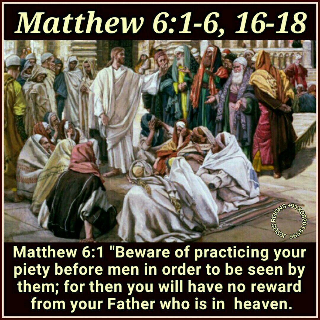 1 "Beware of practicing your piety before men in order to be seen by them; for then you will have no reward from your Father who is in heaven. 2 "Thus, when you give alms, sound no trumpet before you, as the hypocrites do in the synagogues and in the streets, that they may be praised by men. Truly, I say to you, they have received their reward. 3 But when you give alms, do not let your left hand know what your right hand is doing, 4 so that your alms may be in secret; and your Father who sees in secret will reward you. 5 "And when you pray, you must not be like the hypocrites; for they love to stand and pray in the synagogues and at the street corners, that they may be seen by men. Truly, I say to you, they have received their reward. 6 But when you pray, go into your room and shut the door and pray to your Father who is in secret; and your Father who sees in secret will reward you. 16 "And when you fast, do not look dismal, like the hypocrites, for they disfigure their faces that their fasting may be seen by men. Truly, I say to you, they have received their reward. 17 But when you fast, anoint your head and wash your face, 18 that your fasting may not be seen by men but by your Father who is in secret; and your Father who sees in secret will reward you.