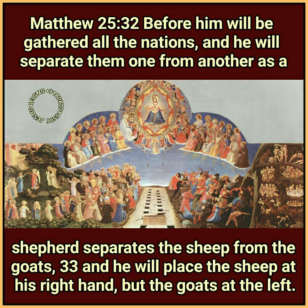 31 "When the Son of man comes in his glory, and all the angels with him, then he will sit on his glorious throne. 32 Before him will be gathered all the nations, and he will separate them one from another as a shepherd separates the sheep from the goats, 33 and he will place the sheep at his right hand, but the goats at the left.34 Then the King will say to those at his right hand, `Come, O blessed of my Father, inherit the kingdom prepared for you from the foundation of the world; 35 for I was hungry and you gave me food, I was thirsty and you gave me drink, I was a stranger and you welcomed me, 36 I was naked and you clothed me, I was sick and you visited me, I was in prison and you came to me.'