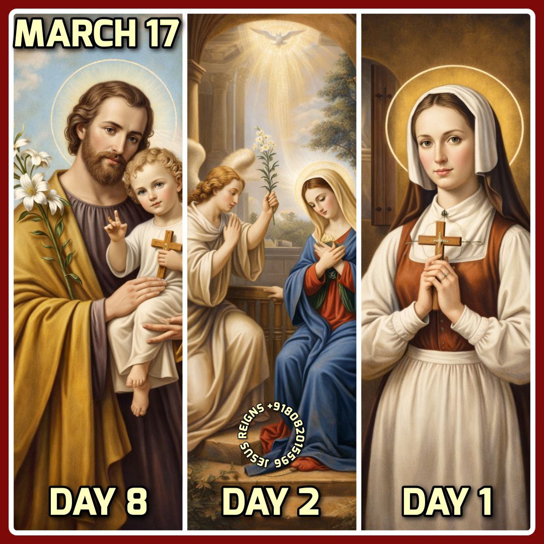 PRAYER BEFORE THE NOVENA: Great Saint Joseph, prostrate at thy feet with feelings of unlimited confidence, we beg thee to bless the Novena that I pray in thy honor. I will meditate upon thy virtues; grant that I may learn fully to appreciate them. The knowledge of them will be the source of great confusion for me because of the poverty and destitution of my soul. Great dispenser of the heavenly treasures, assist me in my poverty, help me to display thy virtues in my own soul. "Thou art never invoked in vain," says the seraphic St. Teresa of Jesus; be thou to me what thou hast been to that Spouse of the Sacred Heart of Jesus; graciously hearken to me as thou didst hearken to her. Amen.
