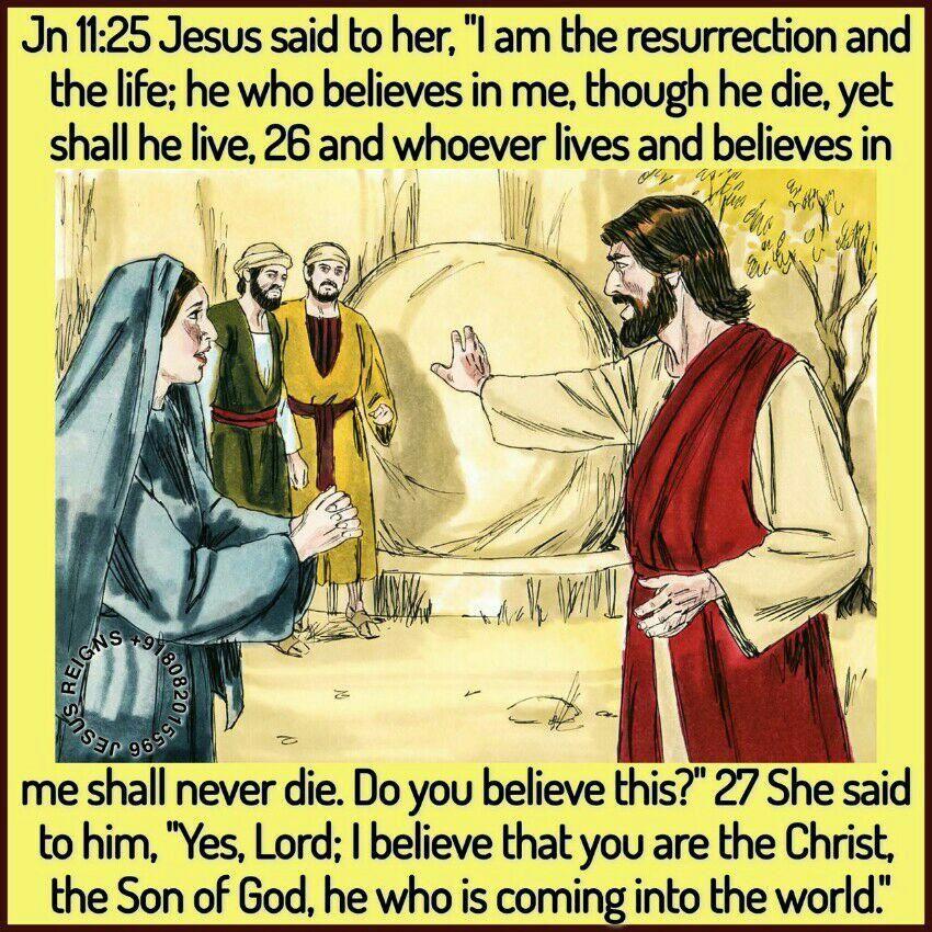 17 Now when Jesus came, he found that Lazarus had already been in the tomb four days. 18 Bethany was near Jerusalem, about two miles off, 19 and many of the Jews had come to Martha and Mary to console them concerning their brother. 20 When Martha heard that Jesus was coming, she went and met him, while Mary sat in the house. 21 Martha said to Jesus, "Lord, if you had been here, my brother would not have died. 22 And even now I know that whatever you ask from God, God will give you." 23 Jesus said to her, "Your brother will rise again." 24 Martha said to him, "I know that he will rise again in the resurrection at the last day." 25 Jesus said to her, "I am the resurrection and the life; he who believes in me, though he die, yet shall he live, 26 and whoever lives and believes in me shall never die. Do you believe this?" 27 She said to him, "Yes, Lord; I believe that you are the Christ, the Son of God, he who is coming into the world."