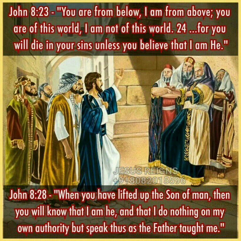 21 Again he said to them, "I go away, and you will seek me and die in your sin; where I am going, you cannot come." 22 Then said the Jews, "Will he kill himself, since he says, `Where I am going, you cannot come'?" 23 He said to them, "You are from below, I am from above; you are of this world, I am not of this world. 24 I told you that you would die in your sins, for you will die in your sins unless you believe that I am he." 25 They said to him, "Who are you?" Jesus said to them, "Even what I have told you from the beginning. 26 I have much to say about you and much to judge; but he who sent me is true, and I declare to the world what I have heard from him." 27 They did not understand that he spoke to them of the Father. 28 So Jesus said, "When you have lifted up the Son of man, then you will know that I am he, and that I do nothing on my own authority but speak thus as the Father taught me. 29 And he who sent me is with me; he has not left me alone, for I always do what is pleasing to him." 30 As he spoke thus, many believed in him.