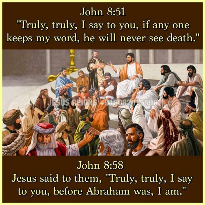 51 Truly, truly, I say to you, if any one keeps my word, he will never see death." 52 The Jews said to him, "Now we know that you have a demon. Abraham died, as did the prophets; and you say, `If any one keeps my word, he will never taste death.' 53 Are you greater than our father Abraham, who died? And the prophets died! Who do you claim to be?" 54 Jesus answered, "If I glorify myself, my glory is nothing; it is my Father who glorifies me, of whom you say that he is your God. 55 But you have not known him; I know him. If I said, I do not know him, I should be a liar like you; but I do know him and I keep his word. 56 Your father Abraham rejoiced that he was to see my day; he saw it and was glad." 57 The Jews then said to him, "You are not yet fifty years old, and have you seen Abraham?" 58 Jesus said to them, "Truly, truly, I say to you, before Abraham was, I am." 59 So they took up stones to throw at him; but Jesus hid himself, and went out of the temple.