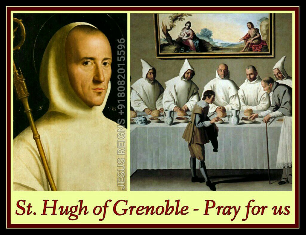 Saint Hugh received, from his cradle, strong impressions of piety through the example and solicitude of his illustrious and holy parents. He was born at Chateauneuf in Dauphiné, France, in 1053. His father, Odilo, who served his country in an honorable post in the army, labored by all means in his power to make his soldiers faithful servants of their Creator, and by severe punishments, to restrain vice. By the advice of his son, Saint Hugh, in his later years he became a Carthusian monk, and died at the age of one hundred, having received Extreme Unction and Viaticum from the hands of his son. Under his direction, his mother had served God in her own house for many years by prayer, fasting, and abundant almsgiving; and Saint Hugh also assisted her in her last hours.
