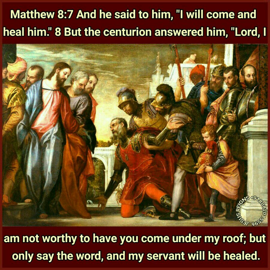5 As he entered Capernaum, a centurion came forward to him, beseeching him 6 and saying, "Lord, my servant is lying paralyzed at home, in terrible distress." 7 And he said to him, "I will come and heal him." 8 But the centurion answered him, "Lord, I am not worthy to have you come under my roof; but only say the word, and my servant will be healed. 9 For I am a man under authority, with soldiers under me; and I say to one, Go,' and he goes, and to another, Come,' and he comes, and to my slave, `Do this,' and he does it." 10 When Jesus heard him, he marveled, and said to those who followed him, "Truly, I say to you, not even in Israel have I found such faith. 11 I tell you, many will come from east and west and sit at table with Abraham, Isaac, and Jacob in the kingdom of heaven