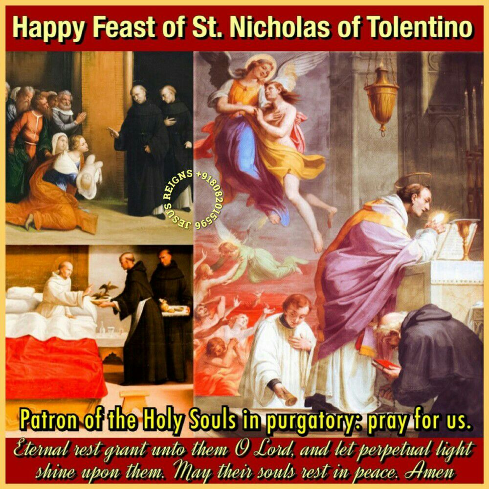On a certain Saturday night as he lay in bed, Nicholas heard the voice of someone who identified himself as Fra Pellegrino of Osimo, a deceased friar whom Nicholas had known. Fra Pellegrino revealed that he was in Purgatory and begged Nicholas to offer Mass for him and for other suffering souls so that they might be set free. For the next seven days Nicholas did so and was rewarded with a second vision in which the deceased confrère expressed his gratitude and assurance that a great number of people were now enjoying the presence of God through Nicholas' prayers. As this event became known, many people approached Nicholas, asking his intercession on behalf of their own deceased relatives and friends.