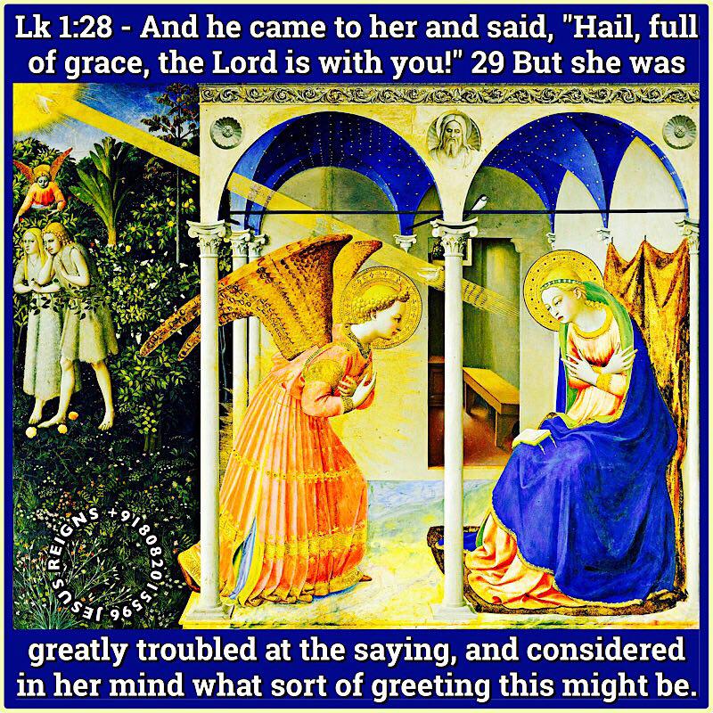 26 In the sixth month the angel Gabriel was sent from God to a city of Galilee named Nazareth, 27 to a virgin betrothed to a man whose name was Joseph, of the house of David; and the virgin's name was Mary. 28 And he came to her and said, "Hail, full of grace, the Lord is with you!" 29 But she was greatly troubled at the saying, and considered in her mind what sort of greeting this might be. 30 And the angel said to her, "Do not be afraid, Mary, for you have found favor with God. 31 And behold, you will conceive in your womb and bear a son, and you shall call his name Jesus. 32 He will be great, and will be called the Son of the Most High; and the Lord God will give to him the throne of his father David, 33 and he will reign over the house of Jacob for ever; and of his kingdom there will be no end." 34 And Mary said to the angel, "How shall this be, since I have no husband?" 35 And the angel said to her, "The Holy Spirit will come upon you, and the power of the Most High will overshadow you; therefore the child to be born will be called holy, the Son of God. 36 And behold, your kinswoman Elizabeth in her old age has also conceived a son; and this is the sixth month with her who was called barren. 37 For with God nothing will be impossible."38 And Mary said, "Behold, I am the handmaid of the Lord; let it be to me according to your word." And the angel departed from her.