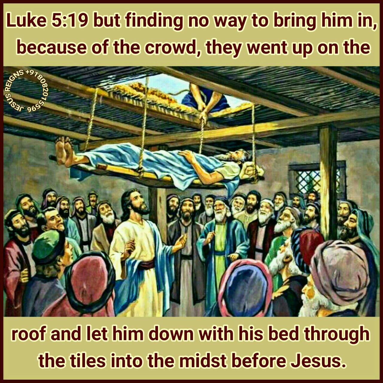 17 On one of those days, as he was teaching, there were Pharisees and teachers of the law sitting by, who had come from every village of Galilee and Judea and from Jerusalem; and the power of the Lord was with him to heal. 18 And behold, men were bringing on a bed a man who was paralyzed, and they sought to bring him in and lay him before Jesus; 19 but finding no way to bring him in, because of the crowd, they went up on the roof and let him down with his bed through the tiles into the midst before Jesus. 20 And when he saw their faith he said, "Man, your sins are forgiven you." 21 And the scribes and the Pharisees began to question, saying, "Who is this that speaks blasphemies? Who can forgive sins but God only?" 22 When Jesus perceived their questionings, he answered them, "Why do you question in your hearts? 23 Which is easier, to say, 'Your sins are forgiven you,' or to say, 'Rise and walk?' 24 But that you may know that the Son of man has authority on earth to forgive sins" --he said to the man who was paralyzed-- "I say to you, rise, take up your bed and go home." 25 And immediately he rose before them, and took up that on which he lay, and went home, glorifying God. 26 And amazement seized them all, and they glorified God and were filled with awe, saying, "We have seen strange things today."