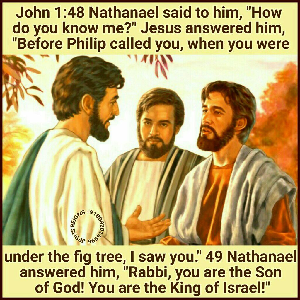 43 The next day Jesus decided to go to Galilee. And he found Philip and said to him, "Follow me." 44 Now Philip was from Bethsaida, the city of Andrew and Peter. 45 Philip found Nathanael, and said to him, "We have found him of whom Moses in the law and also the prophets wrote, Jesus of Nazareth, the son of Joseph." 46 Nathanael said to him, "Can anything good come out of Nazareth?" Philip said to him, "Come and see." 47 Jesus saw Nathanael coming to him, and said of him, "Behold, an Israelite indeed, in whom is no guile!" 48 Nathanael said to him, "How do you know me?" Jesus answered him, "Before Philip called you, when you were under the fig tree, I saw you." 49 Nathanael answered him, "Rabbi, you are the Son of God! You are the King of Israel!" 50 Jesus answered him, "Because I said to you, I saw you under the fig tree, do you believe? You shall see greater things than these." 51 And he said to him, "Truly, truly, I say to you, you will see heaven opened, and the angels of God ascending and descending upon the Son of man."