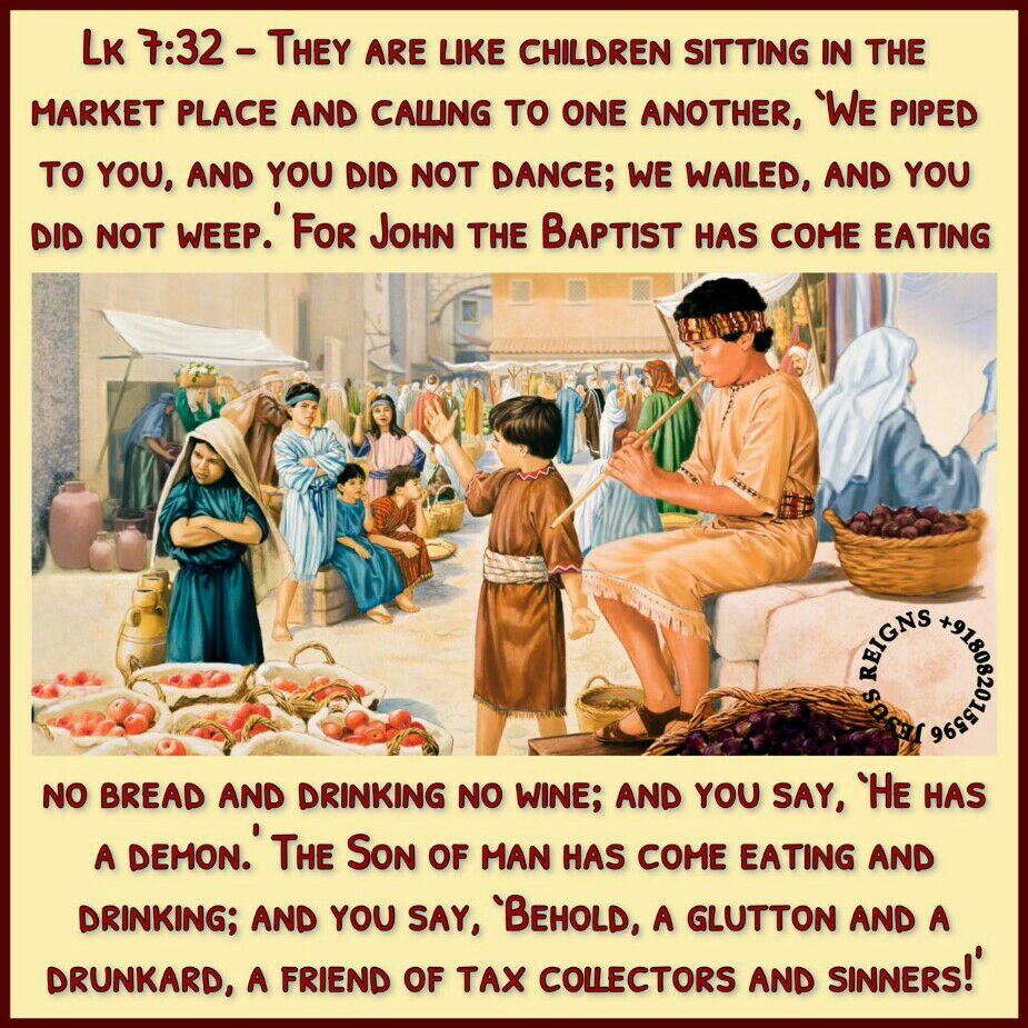 31 "To what then shall I compare the men of this generation, and what are they like? 32 They are like children sitting in the market place and calling to one another, `We piped to you, and you did not dance; we wailed, and you did not weep.' 33 For John the Baptist has come eating no bread and drinking no wine; and you say, `He has a demon.' 34 The Son of man has come eating and drinking; and you say, `Behold, a glutton and a drunkard, a friend of tax collectors and sinners!' 35 Yet wisdom is justified by all her children."