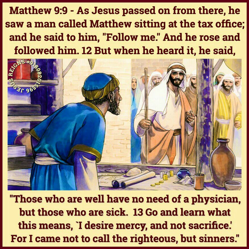 9 As Jesus passed on from there, he saw a man called Matthew sitting at the tax office; and he said to him, "Follow me." And he rose and followed him. 10 And as he sat at table in the house, behold, many tax collectors and sinners came and sat down with Jesus and his disciples. 11 And when the Pharisees saw this, they said to his disciples, "Why does your teacher eat with tax collectors and sinners?" 12 But when he heard it, he said, "Those who are well have no need of a physician, but those who are sick. 13 Go and learn what this means, `I desire mercy, and not sacrifice.' For I came not to call the righteous, but sinners."