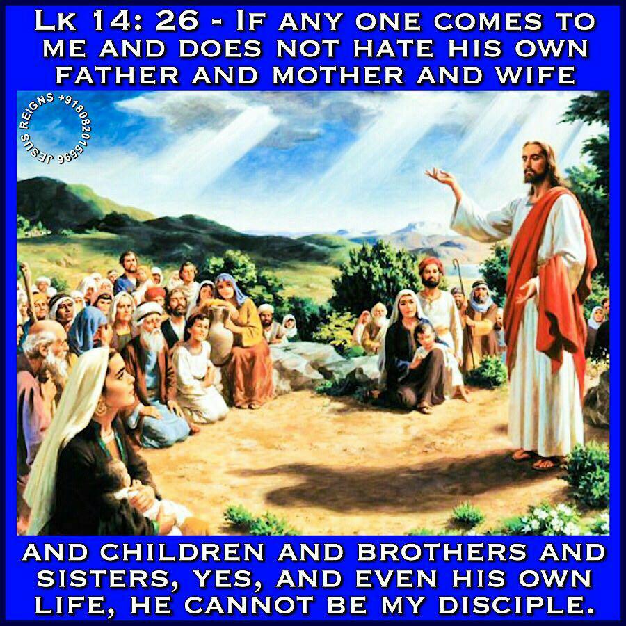 25 Now great multitudes accompanied him; and he turned and said to them, 26 "If any one comes to me and does not hate his own father and mother and wife and children and brothers and sisters, yes, and even his own life, he cannot be my disciple. 27 Whoever does not bear his own cross and come after me, cannot be my disciple. 28 For which of you, desiring to build a tower, does not first sit down and count the cost, whether he has enough to complete it? 29 Otherwise, when he has laid a foundation, and is not able to finish, all who see it begin to mock him, 30 saying, `This man began to build, and was not able to finish.' 31 Or what king, going to encounter another king in war, will not sit down first and take counsel whether he is able with ten thousand to meet him who comes against him with twenty thousand? 32 And if not, while the other is yet a great way off, he sends an embassy and asks terms of peace. 33 So therefore, whoever of you does not renounce all that he has cannot be my disciple.