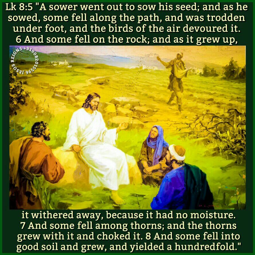 4 And when a great crowd came together and people from town after town came to him, he said in a parable: 5 "A sower went out to sow his seed; and as he sowed, some fell along the path, and was trodden under foot, and the birds of the air devoured it. 6 And some fell on the rock; and as it grew up, it withered away, because it had no moisture. 7 And some fell among thorns; and the thorns grew with it and choked it. 8 And some fell into good soil and grew, and yielded a hundredfold." As he said this, he called out, "He who has ears to hear, let him hear." 9 And when his disciples asked him what this parable meant, 10 he said, "To you it has been given to know the secrets of the kingdom of God; but for others they are in parables, so that seeing they may not see, and hearing they may not understand. 11 Now the parable is this: The seed is the word of God. 12 The ones along the path are those who have heard; then the devil comes and takes away the word from their hearts, that they may not believe and be saved. 13 And the ones on the rock are those who, when they hear the word, receive it with joy; but these have no root, they believe for a while and in time of temptation fall away. 14 And as for what fell among the thorns, they are those who hear, but as they go on their way they are choked by the cares and riches and pleasures of life, and their fruit does not mature. 15 And as for that in the good soil, they are those who, hearing the word, hold it fast in an honest and good heart, and bring forth fruit with patience.