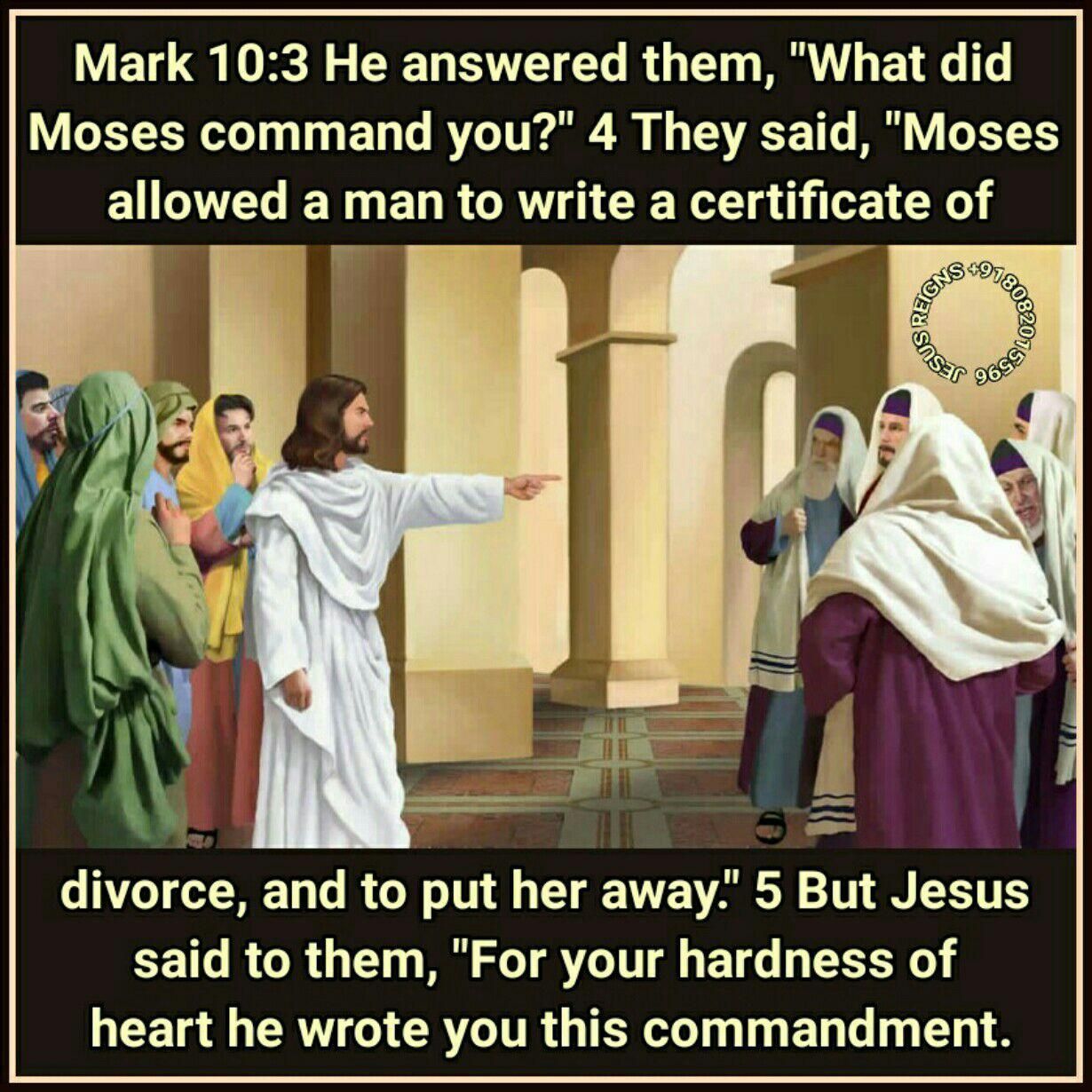 1 And he left there and went to the region of Judea and beyond the Jordan, and crowds gathered to him again; and again, as his custom was, he taught them. 2 And Pharisees came up and in order to test him asked, "Is it lawful for a man to divorce his wife?" 3 He answered them, "What did Moses command you?" 4 They said, "Moses allowed a man to write a certificate of divorce, and to put her away." 5 But Jesus said to them, "For your hardness of heart he wrote you this commandment. 6 But from the beginning of creation, `God made them male and female.' 7 `For this reason a man shall leave his father and mother and be joined to his wife, 8 and the two shall become one flesh.' So they are no longer two but one flesh. 9 What therefore God has joined together, let not man put asunder." 10 And in the house the disciples asked him again about this matter. 11 And he said to them, "Whoever divorces his wife and marries another, commits adultery against her; 12 and if she divorces her husband and marries another, she commits adultery."