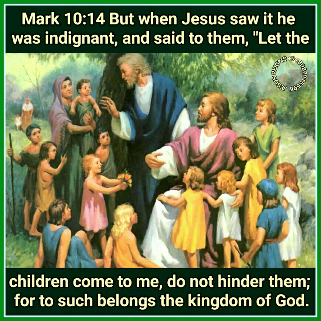 13 And they were bringing children to him, that he might touch them; and the disciples rebuked them. 14 But when Jesus saw it he was indignant, and said to them, "Let the children come to me, do not hinder them; for to such belongs the kingdom of God. 15 Truly, I say to you, whoever does not receive the kingdom of God like a child shall not enter it." 16 And he took them in his arms and blessed them, laying his hands upon them.