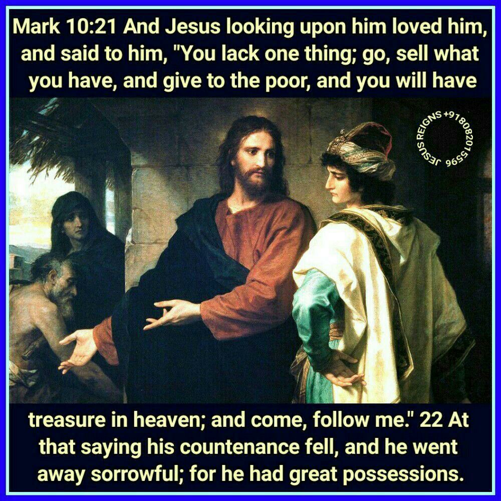 17 And as he was setting out on his journey, a man ran up and knelt before him, and asked him, "Good Teacher, what must I do to inherit eternal life?" 18 And Jesus said to him, "Why do you call me good? No one is good but God alone. 19 You know the commandments: `Do not kill, Do not commit adultery, Do not steal, Do not bear false witness, Do not defraud, Honor your father and mother.'" 20 And he said to him, "Teacher, all these I have observed from my youth." 21 And Jesus looking upon him loved him, and said to him, "You lack one thing; go, sell what you have, and give to the poor, and you will have treasure in heaven; and come, follow me." 22 At that saying his countenance fell, and he went away sorrowful; for he had great possessions.