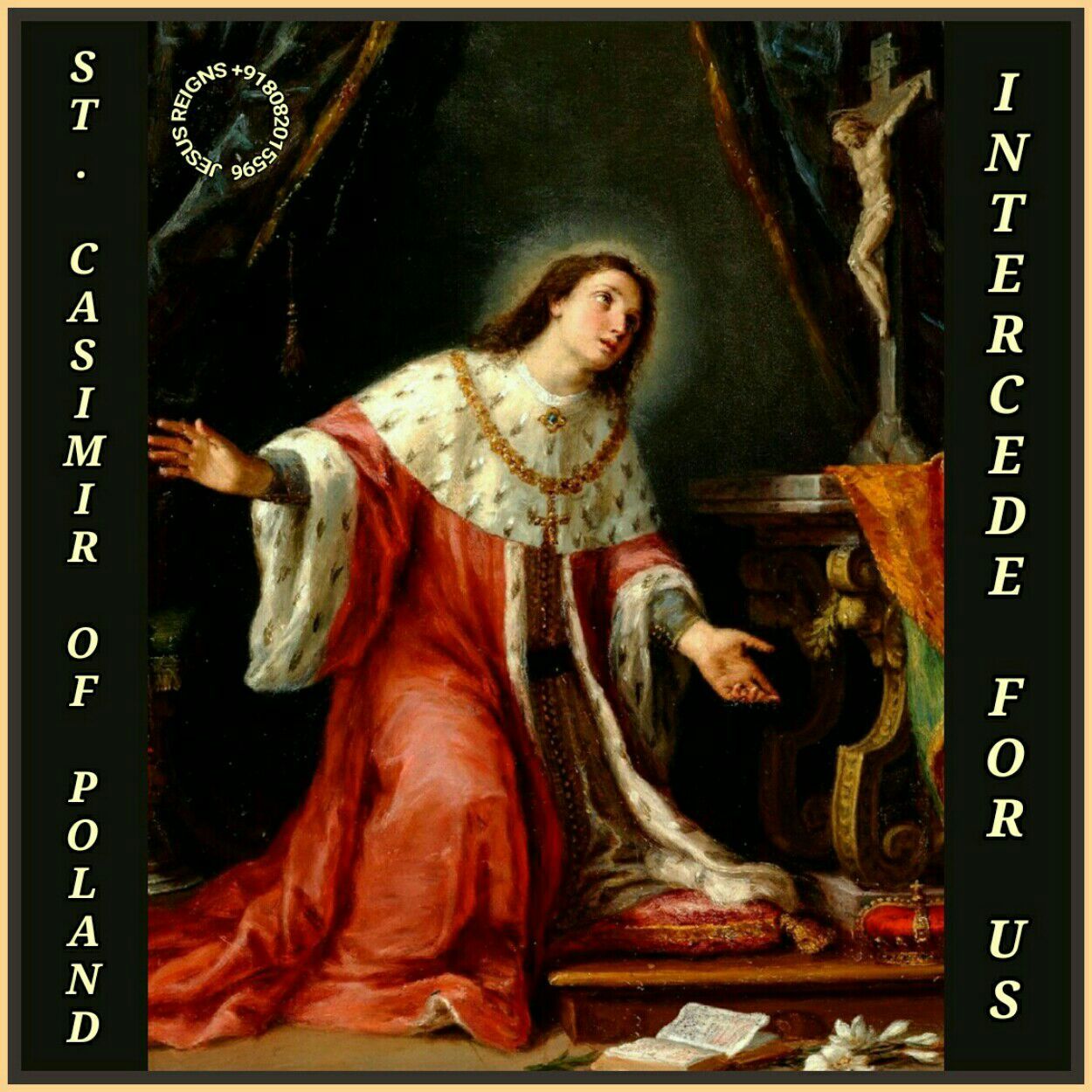 Almighty God, to serve you is to reign; grant that, with the help of Saint Casimir's intercession, we may constantly serve you in holiness and justice. Through our Lord Jesus Christ, your Son, who lives and reigns with you in the unity of the Holy Spirit, one God, for ever and ever. Amen.