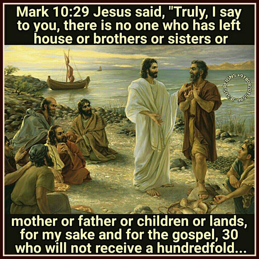 28 Peter began to say to him, "Behold, we have left everything and followed you." 29 Jesus said, "Truly, I say to you, there is no one who has left house or brothers or sisters or mother or father or children or lands, for my sake and for the gospel, 30 who will not receive a hundredfold now in this time, houses and brothers and sisters and mothers and children and lands, with persecutions, and in the age to come eternal life. 31 But many that are first will be last, and the last first."