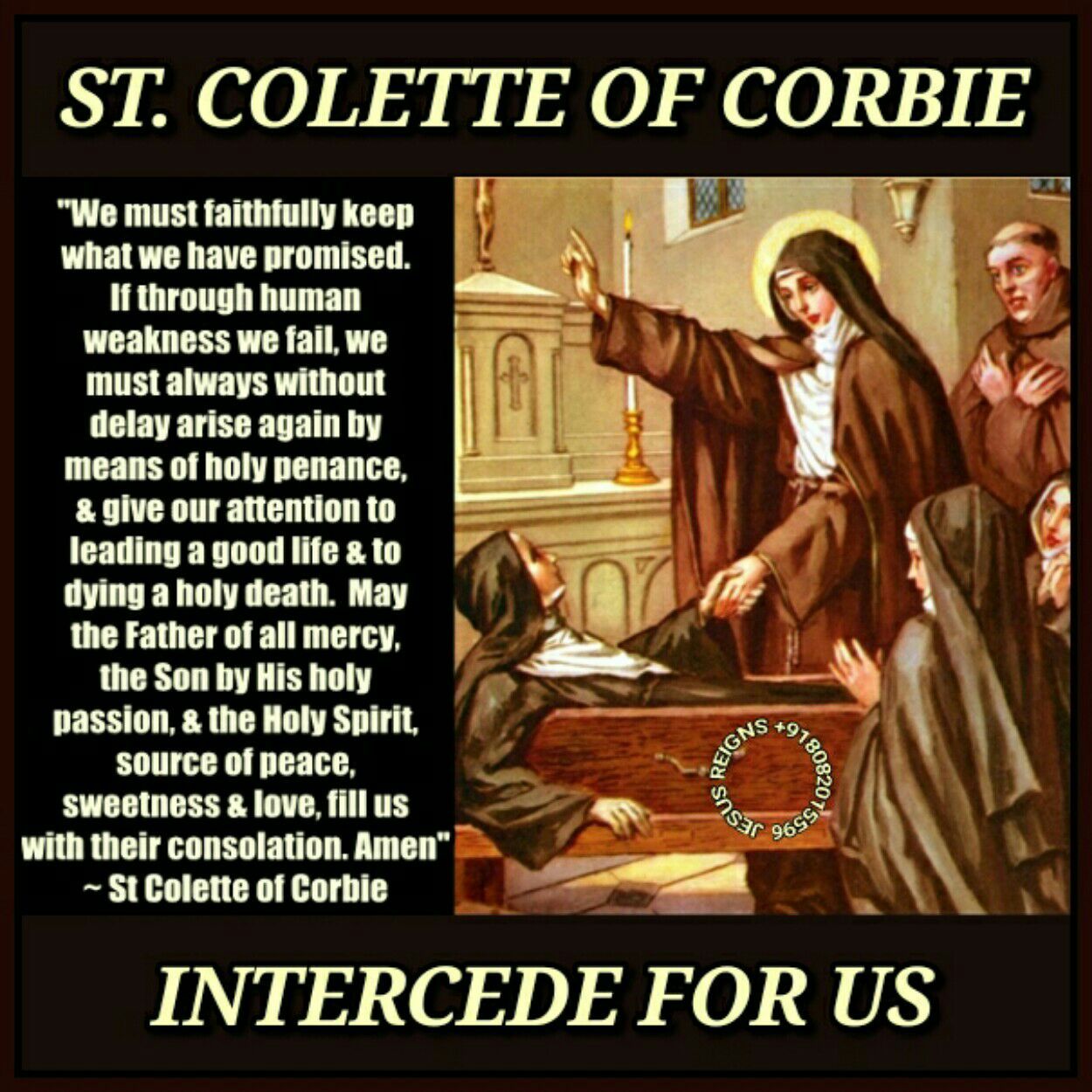 PRAYER: Pray for us, dear Saint Colette, that we may learn the great benefits of sacrifice, especially through fasting, abstinence, and acts of penitence during this holy season of Lent. In Christ's Name we pray. Amen.