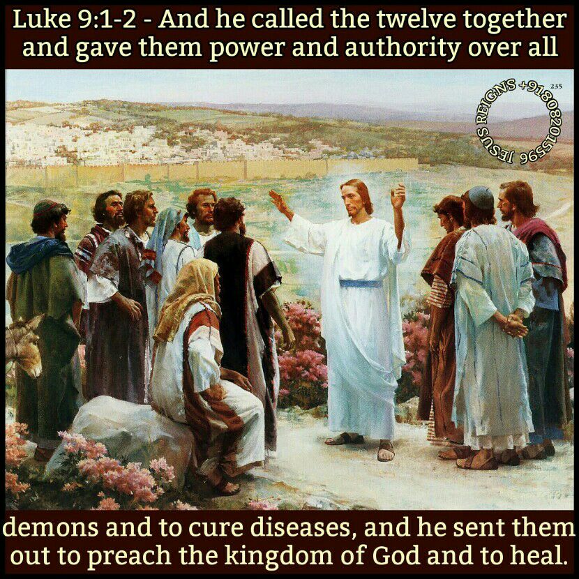 1 And he called the twelve together and gave them power and authority over all demons and to cure diseases, 2 and he sent them out to preach the kingdom of God and to heal. 3 And he said to them, "Take nothing for your journey, no staff, nor bag, nor bread, nor money; and do not have two tunics. 4 And whatever house you enter, stay there, and from there depart. 5 And wherever they do not receive you, when you leave that town shake off the dust from your feet as a testimony against them." 6 And they departed and went through the villages, preaching the gospel and healing everywhere.
