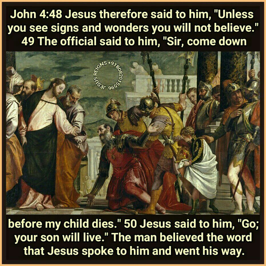 43 After the two days he departed to Galilee. 44 For Jesus himself testified that a prophet has no honor in his own country. 45 So when he came to Galilee, the Galileans welcomed him, having seen all that he had done in Jerusalem at the feast, for they too had gone to the feast. 46 So he came again to Cana in Galilee, where he had made the water wine. And at Capernaum there was an official whose son was ill. 47 When he heard that Jesus had come from Judea to Galilee, he went and begged him to come down and heal his son, for he was at the point of death. 48 Jesus therefore said to him, "Unless you see signs and wonders you will not believe." 49 The official said to him, "Sir, come down before my child dies." 50 Jesus said to him, "Go; your son will live." The man believed the word that Jesus spoke to him and went his way. 51 As he was going down, his servants met him and told him that his son was living. 52 So he asked them the hour when he began to mend, and they said to him, "Yesterday at the seventh hour the fever left him." 53 The father knew that was the hour when Jesus had said to him, "Your son will live"; and he himself believed, and all his household. 54 This was now the second sign that Jesus did when he had come from Judea to Galilee.