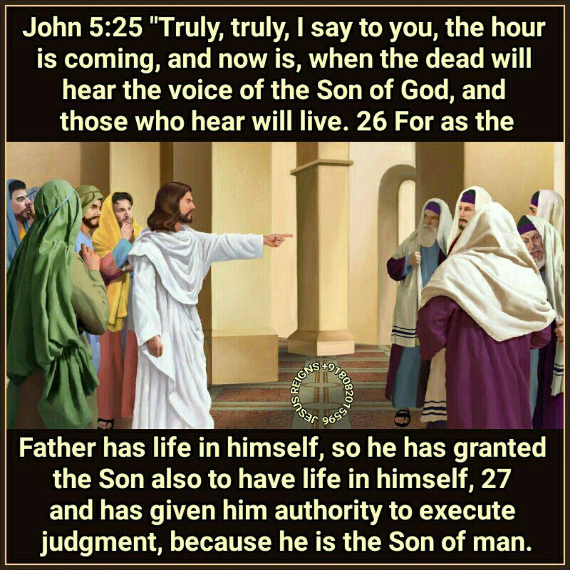 17 But Jesus answered them, "My Father is working still, and I am working." 18 This was why the Jews sought all the more to kill him, because he not only broke the Sabbath but also called God his Father, making himself equal with God. 19 Jesus said to them, "Truly, truly, I say to you, the Son can do nothing of his own accord, but only what he sees the Father doing; for whatever he does, that the Son does likewise. 20 For the Father loves the Son, and shows him all that he himself is doing; and greater works than these will he show him, that you may marvel. 21 For as the Father raises the dead and gives them life, so also the Son gives life to whom he will. 22 The Father judges no one, but has given all judgment to the Son, 23 that all may honor the Son, even as they honor the Father. He who does not honor the Son does not honor the Father who sent him. 24 Truly, truly, I say to you, he who hears my word and believes him who sent me, has eternal life; he does not come into judgment, but has passed from death to life. 25 "Truly, truly, I say to you, the hour is coming, and now is, when the dead will hear the voice of the Son of God, and those who hear will live. 26 For as the Father has life in himself, so he has granted the Son also to have life in himself, 27 and has given him authority to execute judgment, because he is the Son of man. 28 Do not marvel at this; for the hour is coming when all who are in the tombs will hear his voice 29 and come forth, those who have done good, to the resurrection of life, and those who have done evil, to the resurrection of judgment. 30 "I can do nothing on my own authority; as I hear, I judge; and my judgment is just, because I seek not my own will but the will of him who sent me.