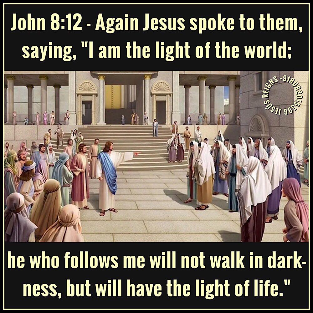 12 Again Jesus spoke to them, saying, "I am the light of the world; he who follows me will not walk in darkness, but will have the light of life." 13 The Pharisees then said to him, "You are bearing witness to yourself; your testimony is not true." 14 Jesus answered, "Even if I do bear witness to myself, my testimony is true, for I know where I have come and where I am going, but you do not know where I come or where I am going. 15 You judge according to the flesh, I judge no one. 16 Yet even if I do judge, my judgment is true, for it is not I alone that judge, but I and he who sent me. 17 In your law it is written that the testimony of two men is true; 18 I bear witness to myself, and the Father who sent me bears witness to me." 19 They said to him therefore, "Where is your Father?" Jesus answered, "You know neither me nor my Father; if you knew me, you would know my Father also." 20 These words he spoke in the treasury, as he taught in the temple; but no one arrested him, because his hour had not yet come.
