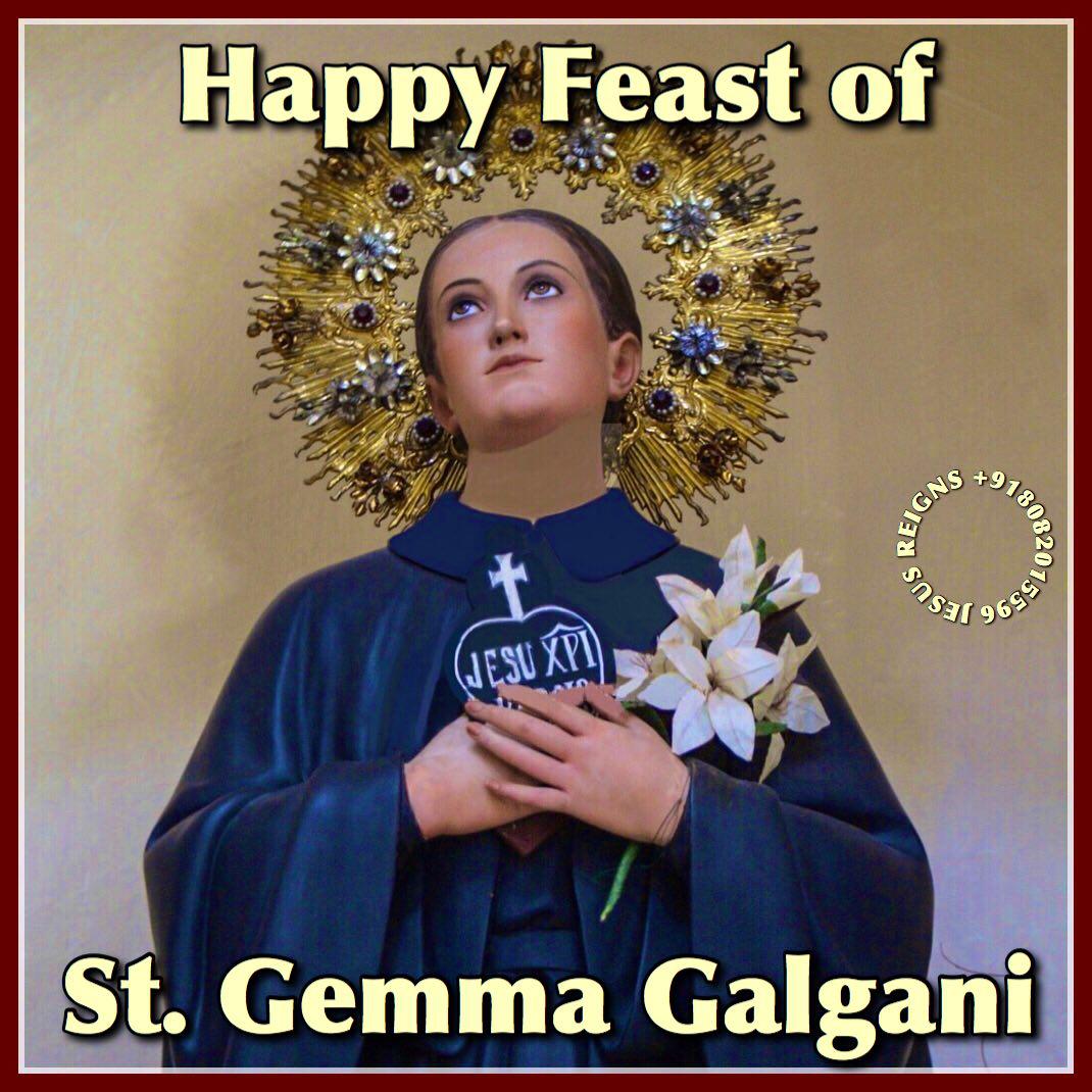 The Passionist St. Gabriel Possenti began appearing to her in a series of visions, encouraging her and helping her to make a Novena to the Sacred Heart of Jesus in hopes for a cure. It was at this time that the attending Doctors resigned her to die. On March 3, 1899, Jesus appeared to Gemma and cured her on the last day of the Novena, which coincided with the First Friday of the month (which is devoted to the Sacred Heart of Jesus). It was at this time also that Gemma began receiving inner locutions (interior words) from Jesus, and she begins to see her guardian Angel who inspires and instructs her in the practice of virtues.