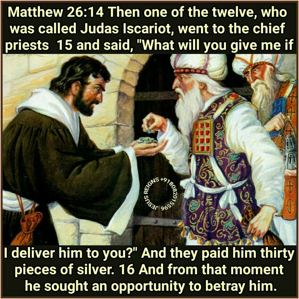 14 Then one of the twelve, who was called Judas Iscariot, went to the chief priests 15 and said, "What will you give me if I deliver him to you?" And they paid him thirty pieces of silver. 16 And from that moment he sought an opportunity to betray him. 17 Now on the first day of Unleavened Bread the disciples came to Jesus, saying, "Where will you have us prepare for you to eat the Passover?" 18 He said, "Go into the city to a certain one, and say to him, `The Teacher says, My time is at hand; I will keep the Passover at your house with my disciples.'" 19 And the disciples did as Jesus had directed them, and they prepared the Passover. 20 When it was evening, he sat at table with the twelve disciples; 21 and as they were eating, he said, "Truly, I say to you, one of you will betray me." 22 And they were very sorrowful, and began to say to him one after another, "Is it I, Lord?" 23 He answered, "He who has dipped his hand in the dish with me, will betray me. 24 The Son of man goes as it is written of him, but woe to that man by whom the Son of man is betrayed! It would have been better for that man if he had not been born." 25 Judas, who betrayed him, said, "Is it I, Master?" He said to him, "You have said so."