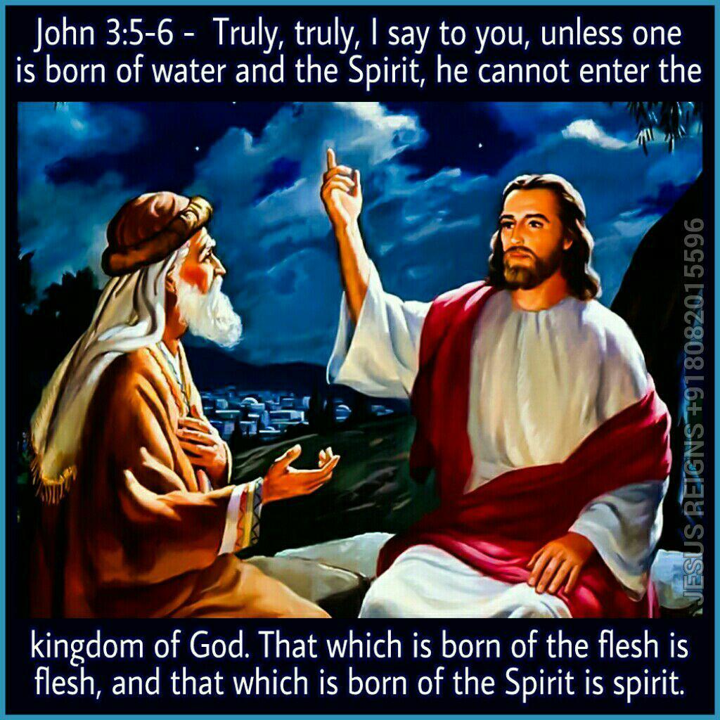 1 Now there was a man of the Pharisees, named Nicodemus, a ruler of the Jews. 2 This man came to Jesus by night and said to him, "Rabbi, we know that you are a teacher come from God; for no one can do these signs that you do, unless God is with him." 3 Jesus answered him, "Truly, truly, I say to you, unless one is born anew, he cannot see the kingdom of God." 4 Nicodemus said to him, "How can a man be born when he is old? Can he enter a second time into his mother's womb and be born?" 5 Jesus answered, "Truly, truly, I say to you, unless one is born of water and the Spirit, he cannot enter the kingdom of God. 6 That which is born of the flesh is flesh, and that which is born of the Spirit is spirit. 7 Do not marvel that I said to you, `You must be born anew.' 8 The wind blows where it wills, and you hear the sound of it, but you do not know whence it comes or whither it goes; so it is with every one who is born of the Spirit."