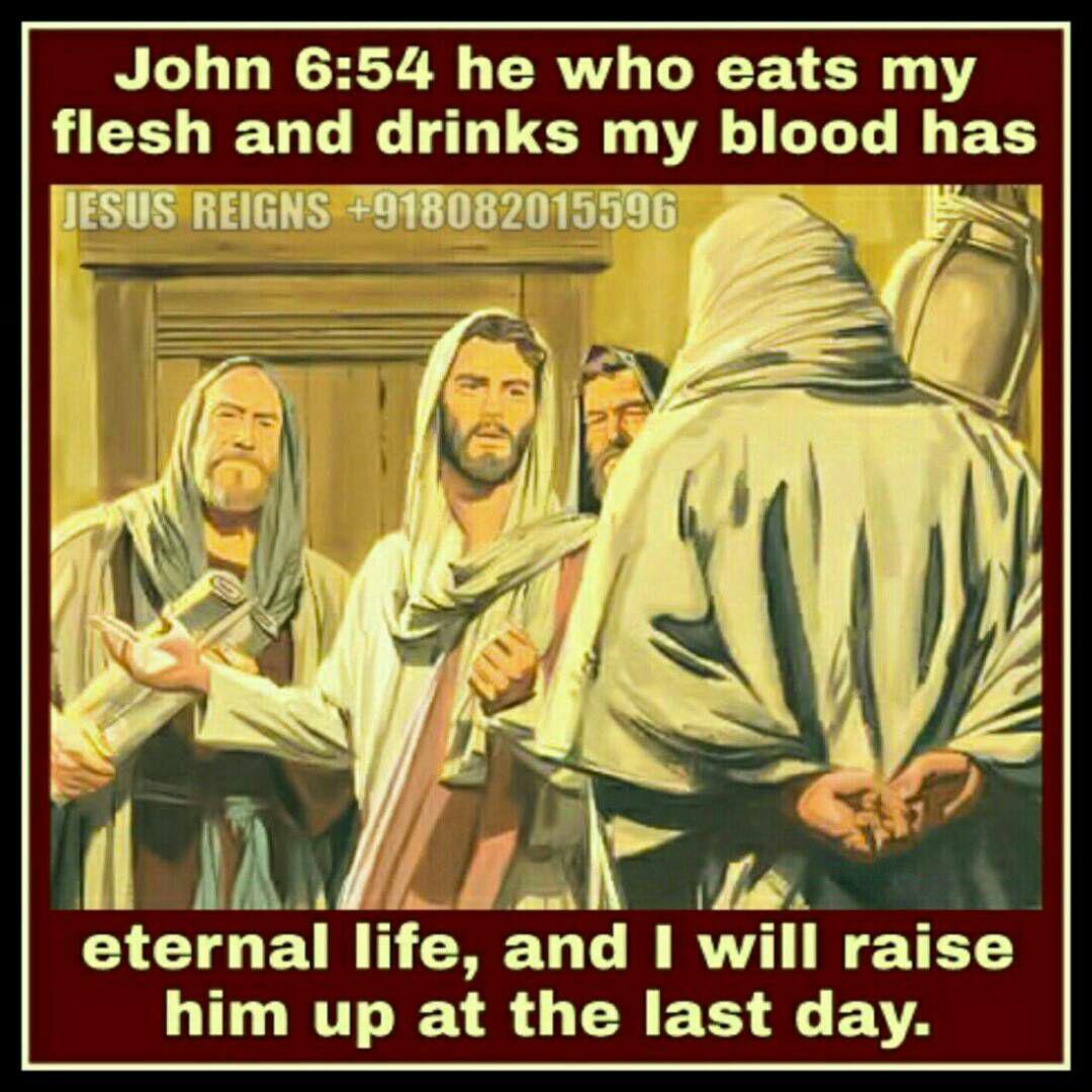 52 The Jews then disputed among themselves, saying, "How can this man give us his flesh to eat?" 53 So Jesus said to them, "Truly, truly, I say to you, unless you eat the flesh of the Son of man and drink his blood, you have no life in you; 54 he who eats my flesh and drinks my blood has eternal life, and I will raise him up at the last day. 55 For my flesh is food indeed, and my blood is drink indeed. 56 He who eats my flesh and drinks my blood abides in me, and I in him. 57 As the living Father sent me, and I live because of the Father, so he who eats me will live because of me. 58 This is the bread which came down from heaven, not such as the fathers ate and died; he who eats this bread will live for ever." 59 This he said in the synagogue, as he taught at Capernaum.